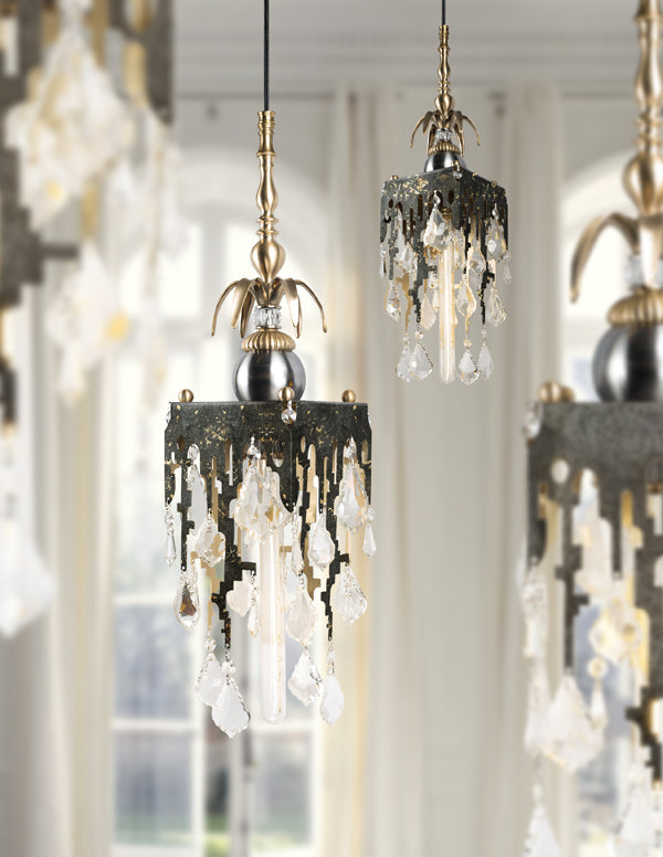 A singular sensation on its own, or as a duet, trio or quartet offering a petite but robust influence in any room. This family of pendalogue crystals effortlessly emerges from a dapper hand-painted metal frame, suspended by a sturdy body of brass, glass and metal ornamentation true to the romantic industrial nature of our creations.